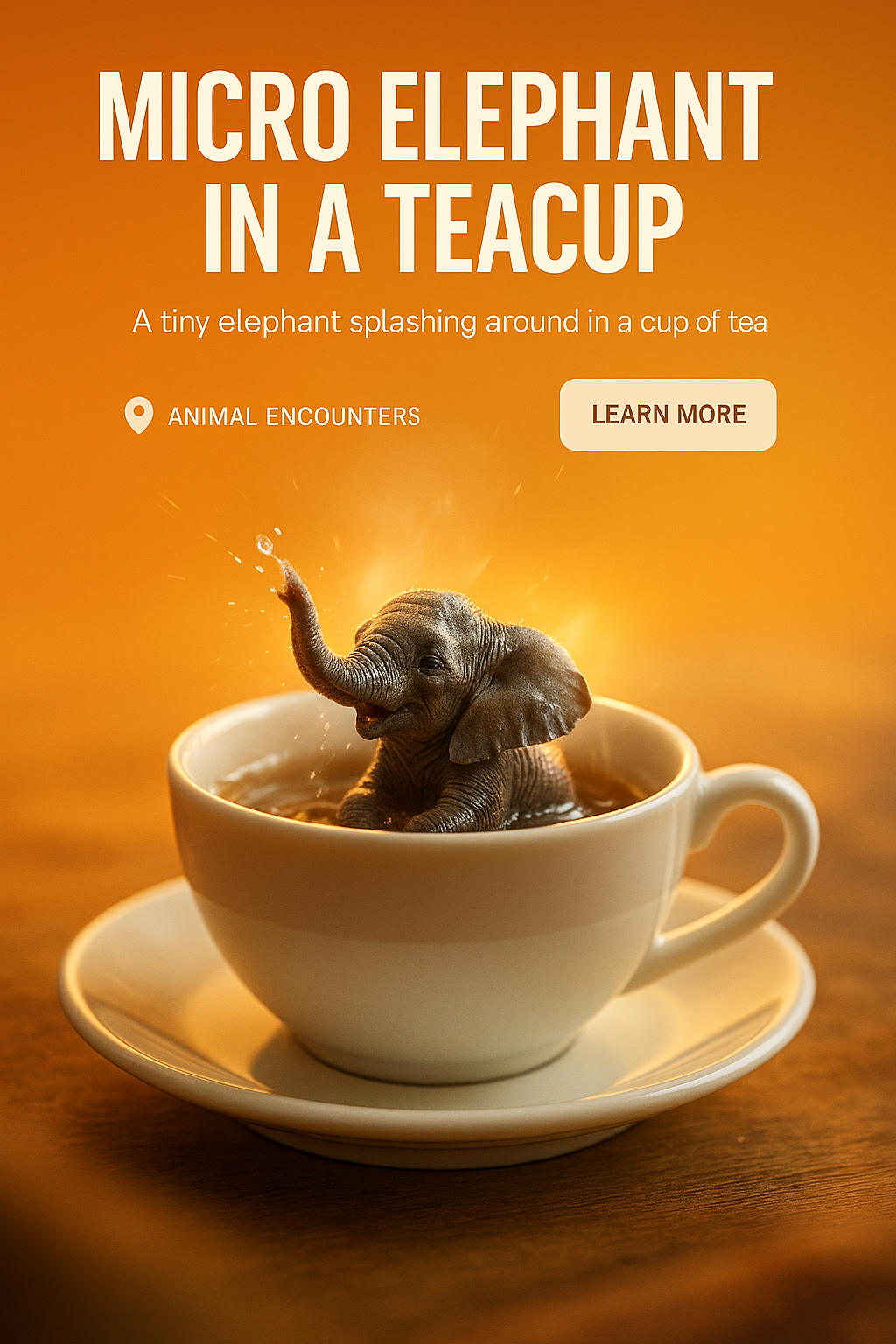 /Collection: /by davooda/Type: PNG/This fun and imaginative digital artwork features a small elephant splashing in a teacup. It's designed as a social media post to engage animal lovers and promote unique encounters.