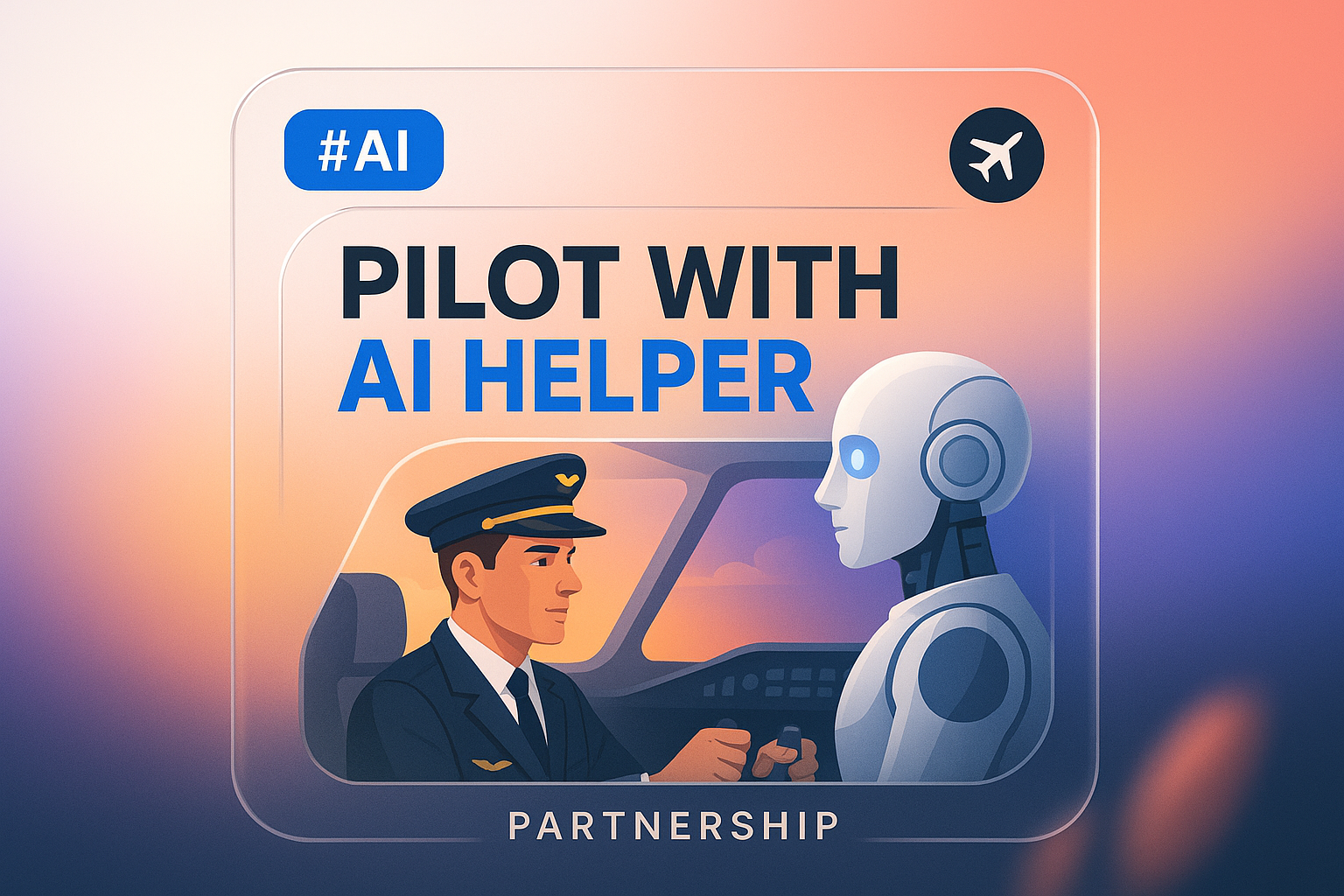A modern illustration depicting a pilot interacting with an AI assistant in a cockpit. The design features a gradient background and clear text elements emphasizing partnership.