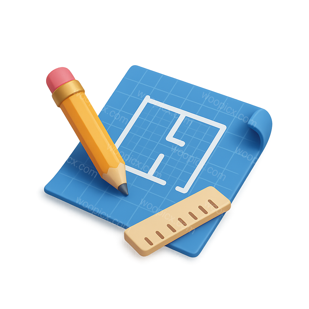 /Premium/Collection: /by davooda/Type: PNG/A 3D isometric icon featuring a blueprint with a pencil and ruler. The blueprint is blue with a grid design, showcasing a simple layout in a three-quarter view.