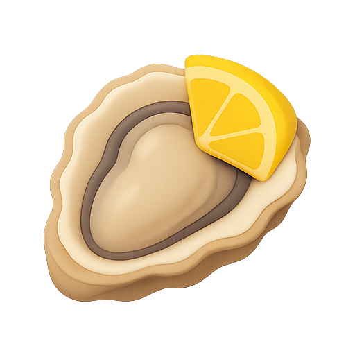 A detailed emoji representation of an oyster shell with a slice of lemon on top. This graphic can be used in digital communication to convey seafood, dining, or culinary themes.