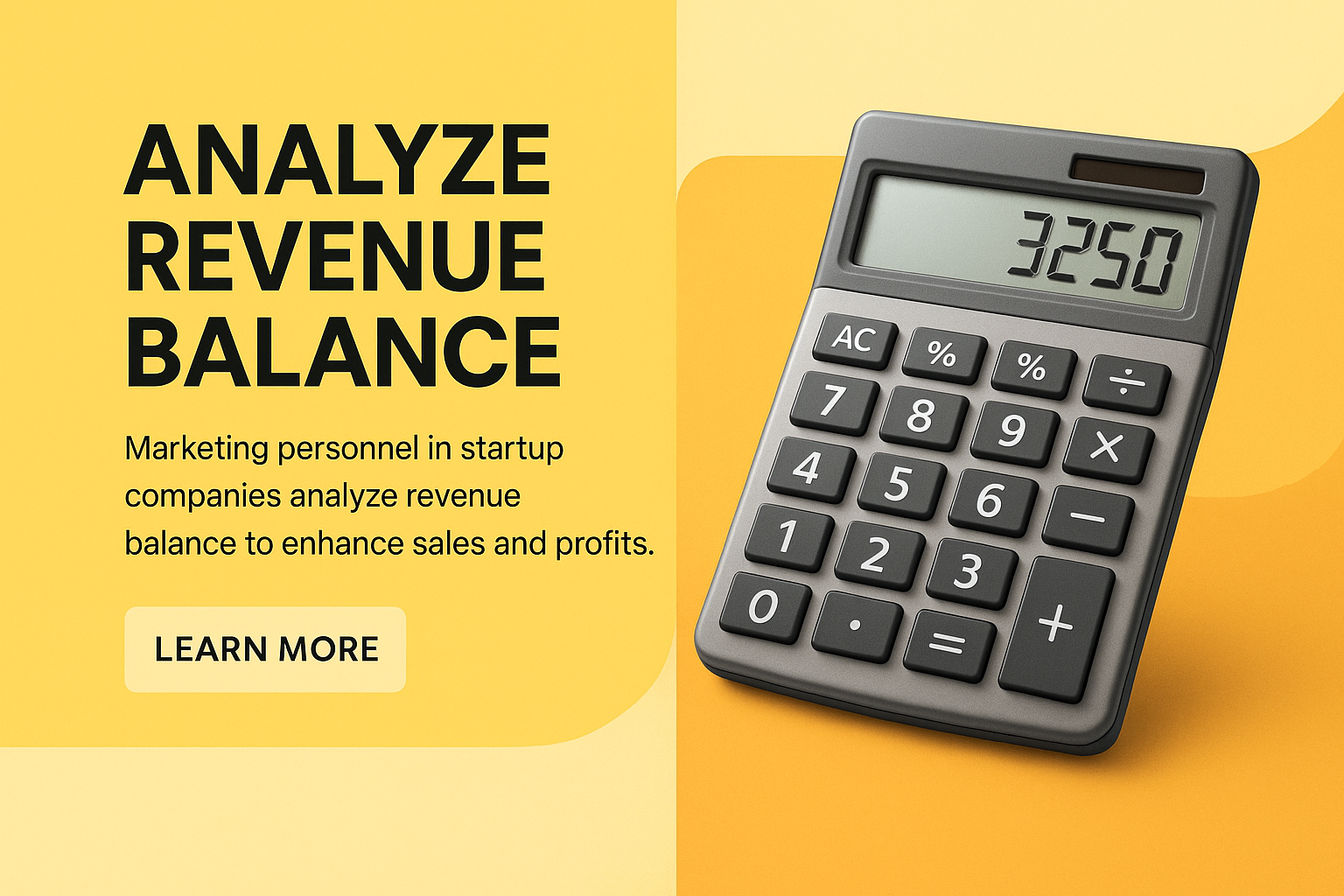A modern corporate design featuring a calculator as the main object, set against a bright geometric background. The typography is bold and clear, emphasizing key messages.