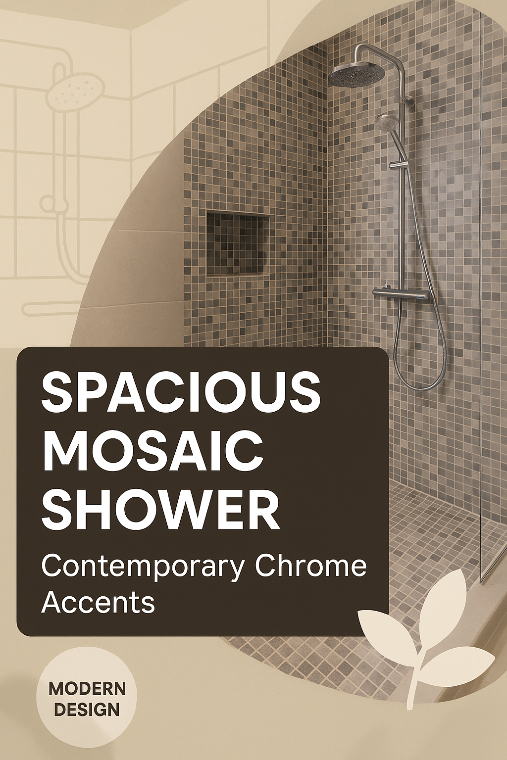 Stylish graphic showcasing a spacious mosaic shower featuring contemporary chrome accents, ideal for interior design inspiration and home renovation marketing.