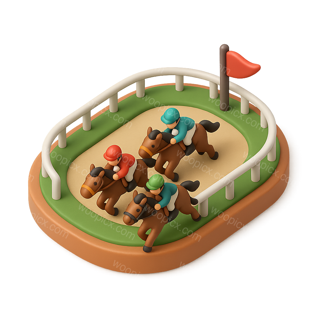 A playful 3D icon depicting a horse race scene with three colorful jockeys on horses, set in a stylized hippodrome with a green track and a flag.