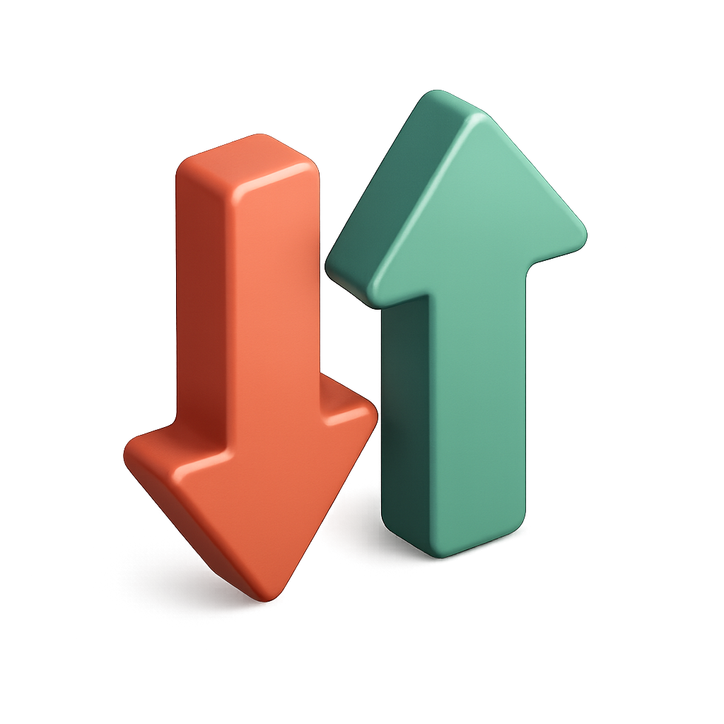 /Collection: /by davooda/Type: PNG/A visually striking 3D isometric icon featuring a downward red arrow and an upward green arrow. Both arrows exhibit a glossy, volumetric effect against a soft gradient background.