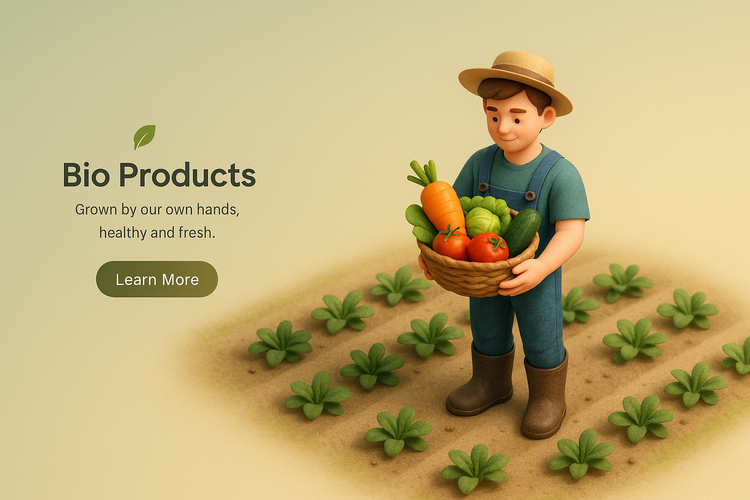 A young farmer holding a basket of fresh vegetables stands in a stylized 3D scene. The background features a smooth gradient, emphasizing the bio products and healthy lifestyle theme.