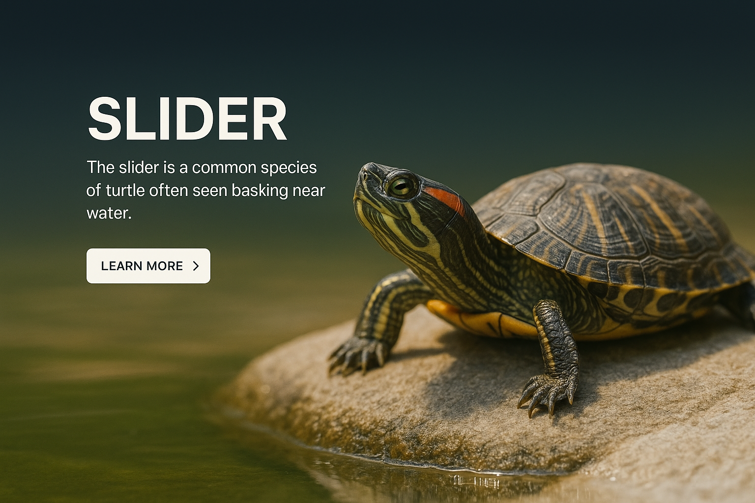 A stylish web design showcasing a slider featuring a turtle basking on a rock near water, with a clean layout, readable text, and a call-to-action button.