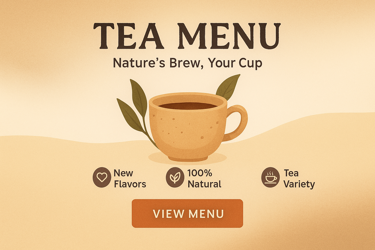 A visually appealing tea menu featuring a stylized cup of tea with natural elements. The design emphasizes new flavors, natural ingredients, and tea variety, inviting users to explore more.