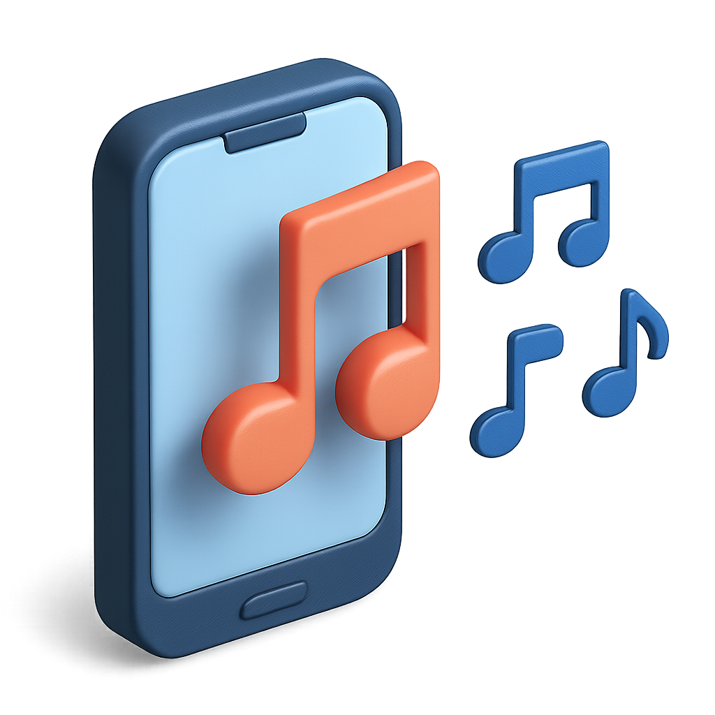 A 3D icon of a smartphone featuring vibrant musical notes, designed with an isometric perspective and a transparent background, emphasizing a modern aesthetic.