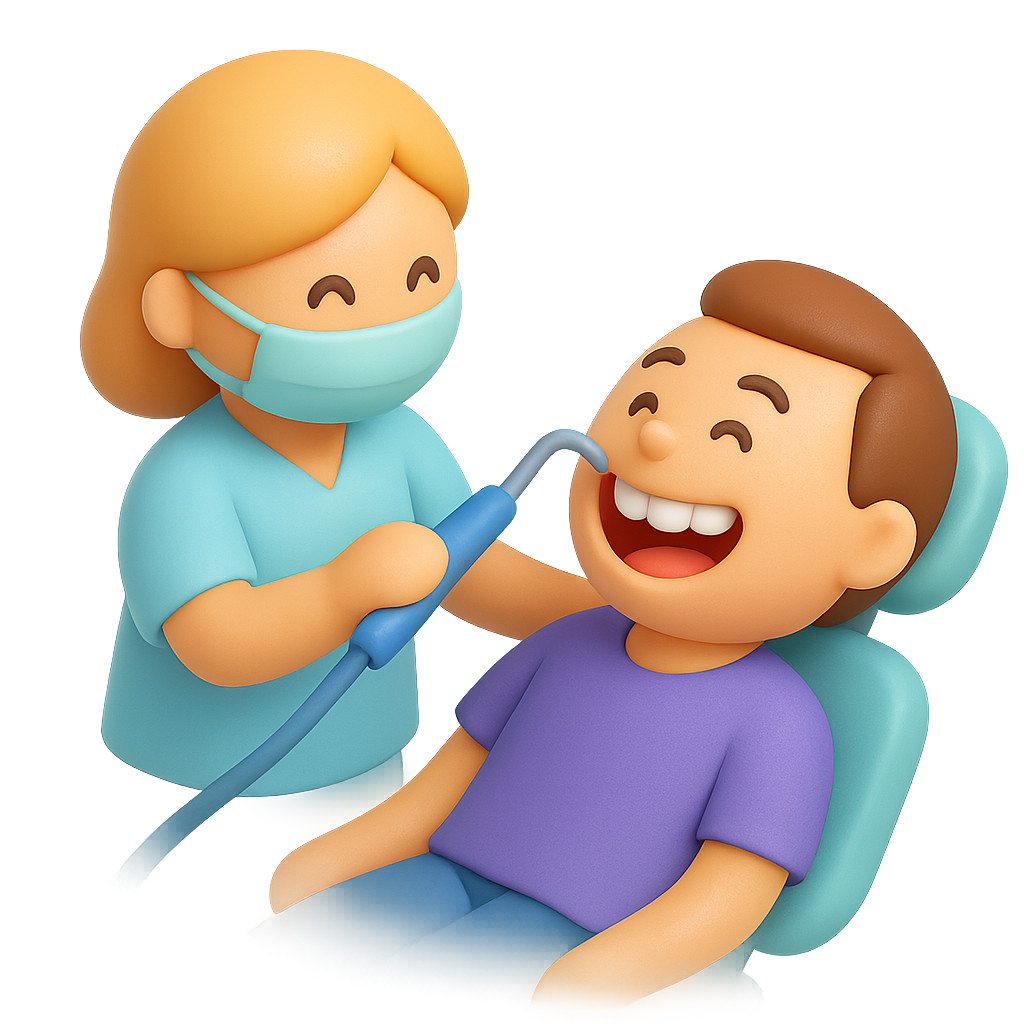 A 3D representation of a dental cleaning scene featuring a smiling patient and a dental professional. The image captures a friendly atmosphere with soft colors and a volumetric feel.
