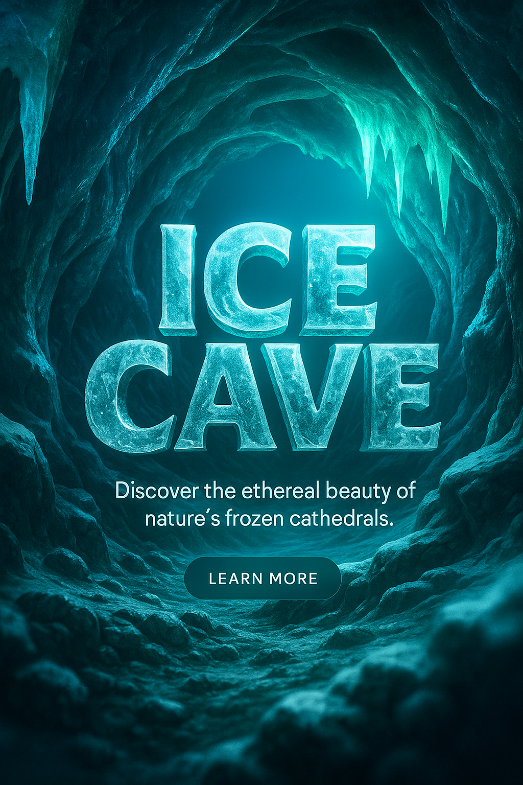 /Collection: /by davooda/Type: PNG/A stunning depiction of an ice cave featuring luminescent blue tones and layered textures. The composition includes bold text highlighting the cave's beauty, inviting exploration.