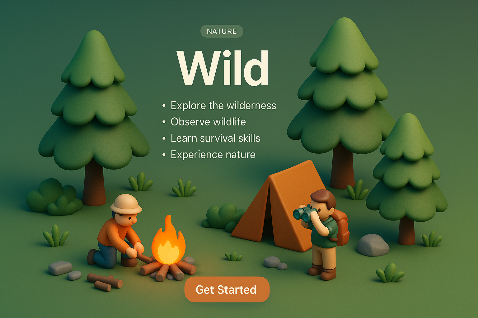 /Collection: /by davooda/Type: PNG/A detailed 3D illustration depicting a miniature camping scene with characters around a campfire, surrounded by trees and a tent. The scene is vibrant and presented from a zoomed-out perspective.