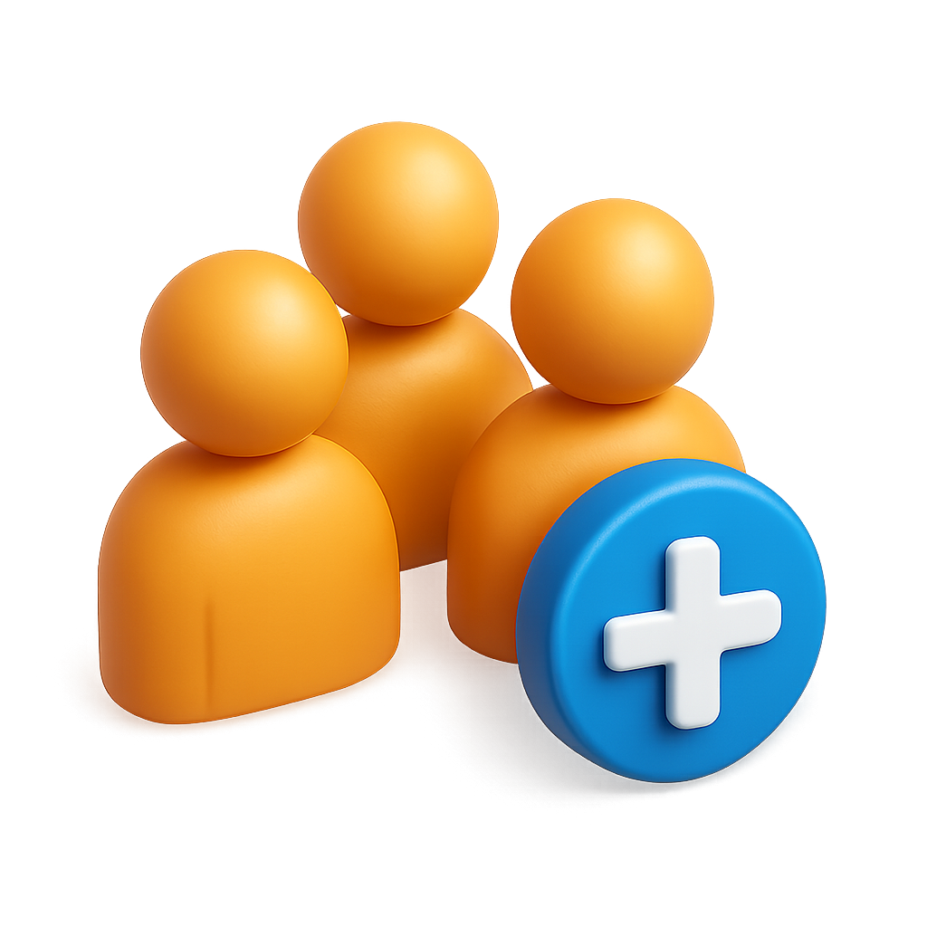 A vibrant 3D icon featuring three stylized figures in orange, accompanied by a blue plus sign. The design emphasizes a modern and isometric aesthetic.