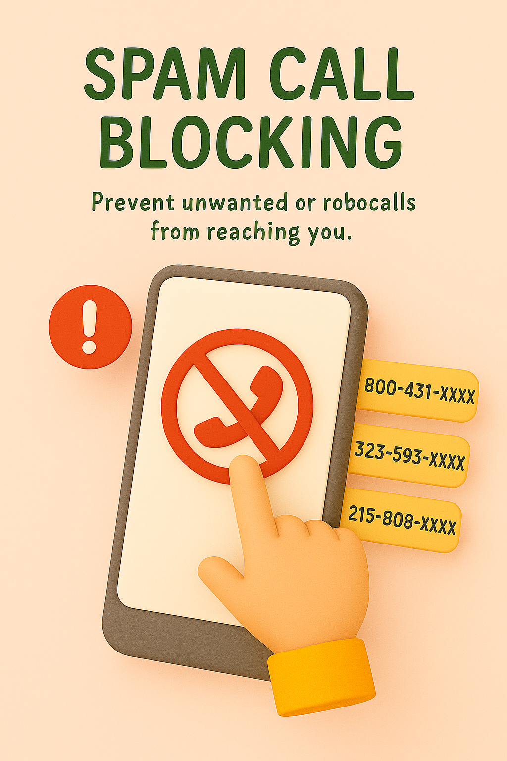 A vibrant 3D illustration showcasing a smartphone with a spam call blocking feature, ideal for tech-related content and consumer awareness campaigns.