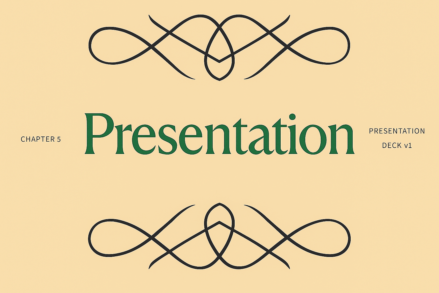 A stylized presentation slide featuring ornate patterns with the word 'Presentation' in prominent green text. The background is a soft beige, enhancing the decorative elements.