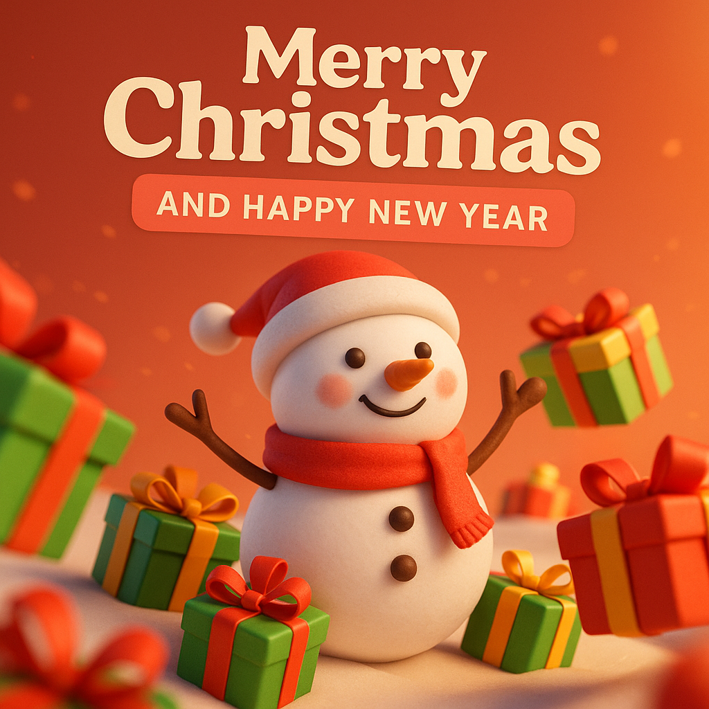 A festive digital illustration featuring a smiling snowman in a Santa hat surrounded by colorful gifts, perfect for holiday greetings and social media posts.