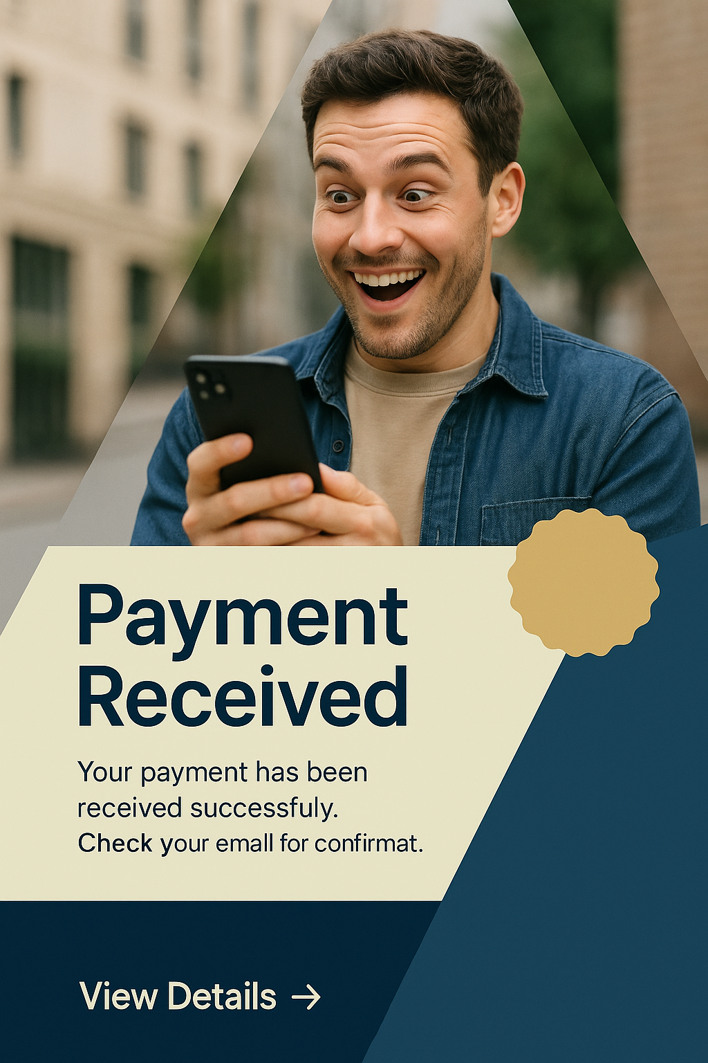 /Collection: /by davooda/Type: PNG/A man displays a surprised and happy expression while checking his phone for a payment notification. The image features layered geometric shapes and a vibrant design scheme.