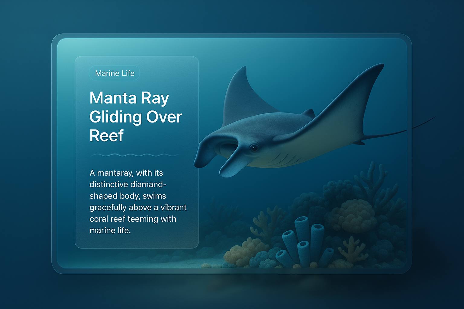 A manta ray elegantly swims above a colorful coral reef, showcasing its unique body shape. The serene underwater scene is complemented by a subtle gradient background.