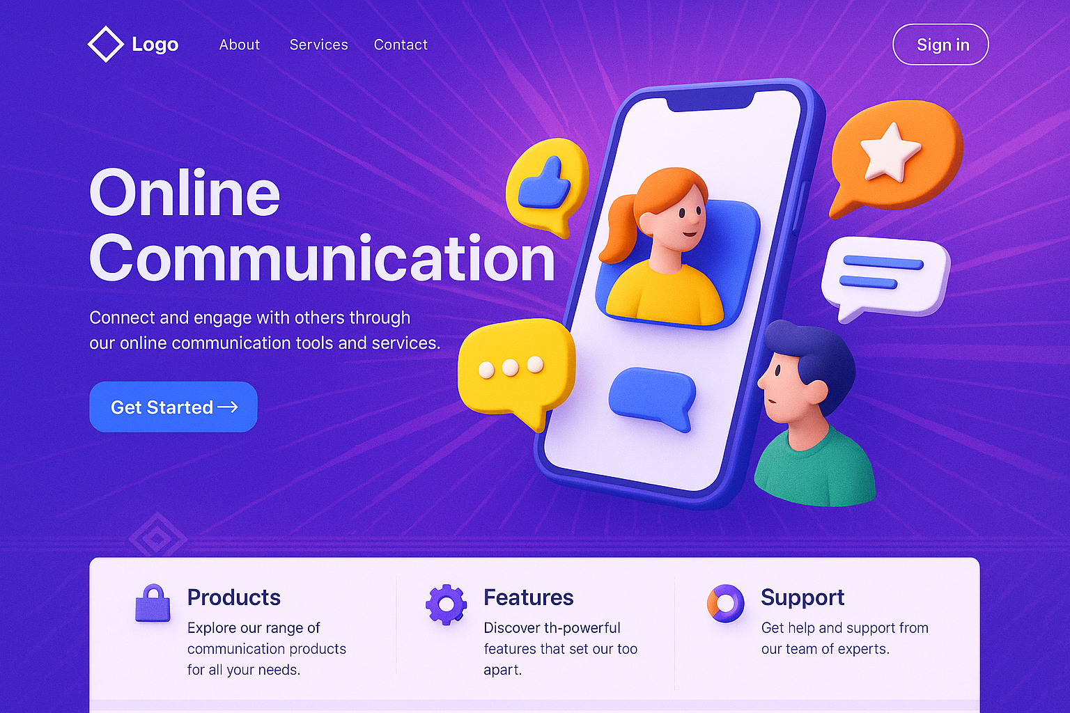 /Collection: /by davooda/Type: PNG/A visually engaging landing page design featuring a smartphone illustration with animated characters discussing in chat bubbles. The layout emphasizes products, features, and support.