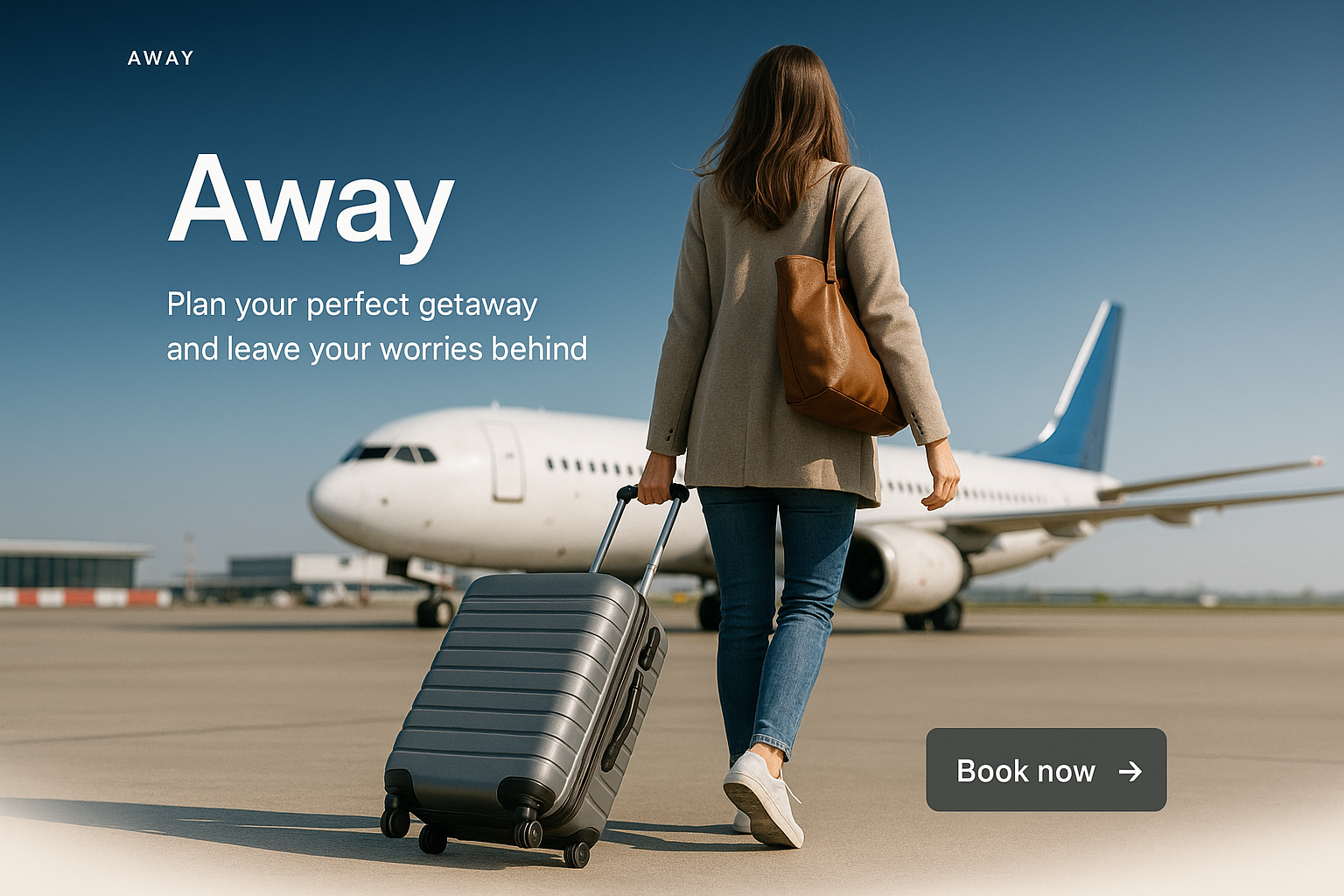 A stylish webpage layout featuring a traveler with a suitcase heading towards an airplane. The design includes a prominent title, a short description, and a call-to-action button, all in a modern style.