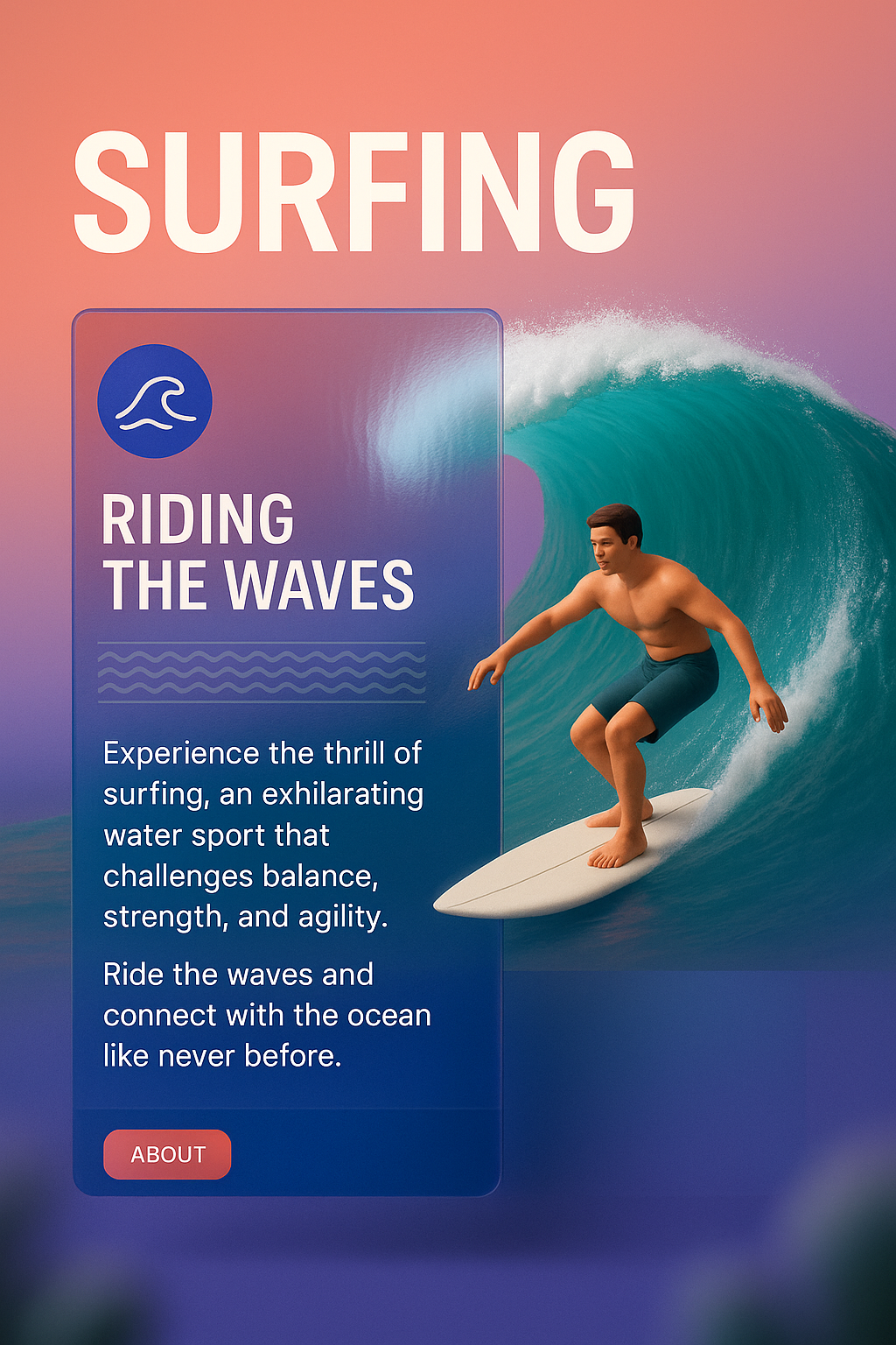 /Collection: /by davooda/Type: PNG/A vibrant 3D illustration of a surfer riding a wave, combined with an engaging informational panel. The panel features a clear title, icon, and descriptive text about surfing, all designed with a cohesive style.