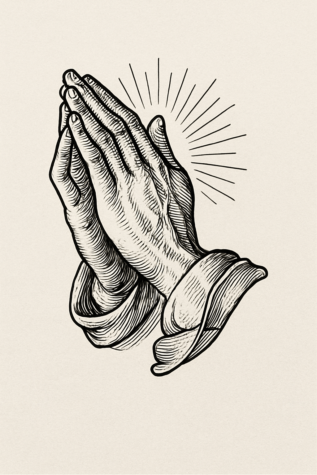 A detailed illustration of clasped hands in prayer, featuring a vintage style. Ideal for religious contexts, spiritual content, or artistic expressions.