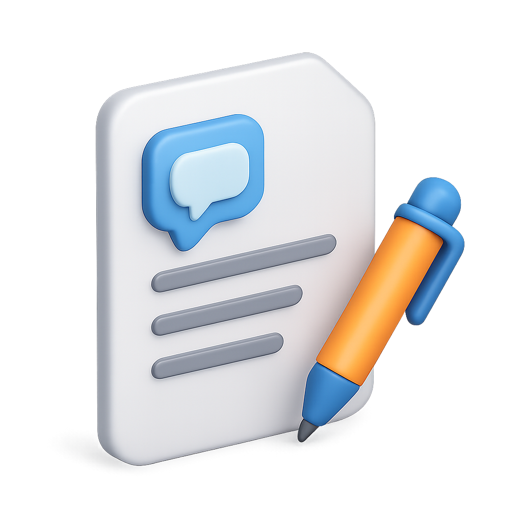 A 3D icon depicting a document with lines representing text and a speech bubble, alongside a stylized orange pen. The design features a modern isometric look with a transparent background.