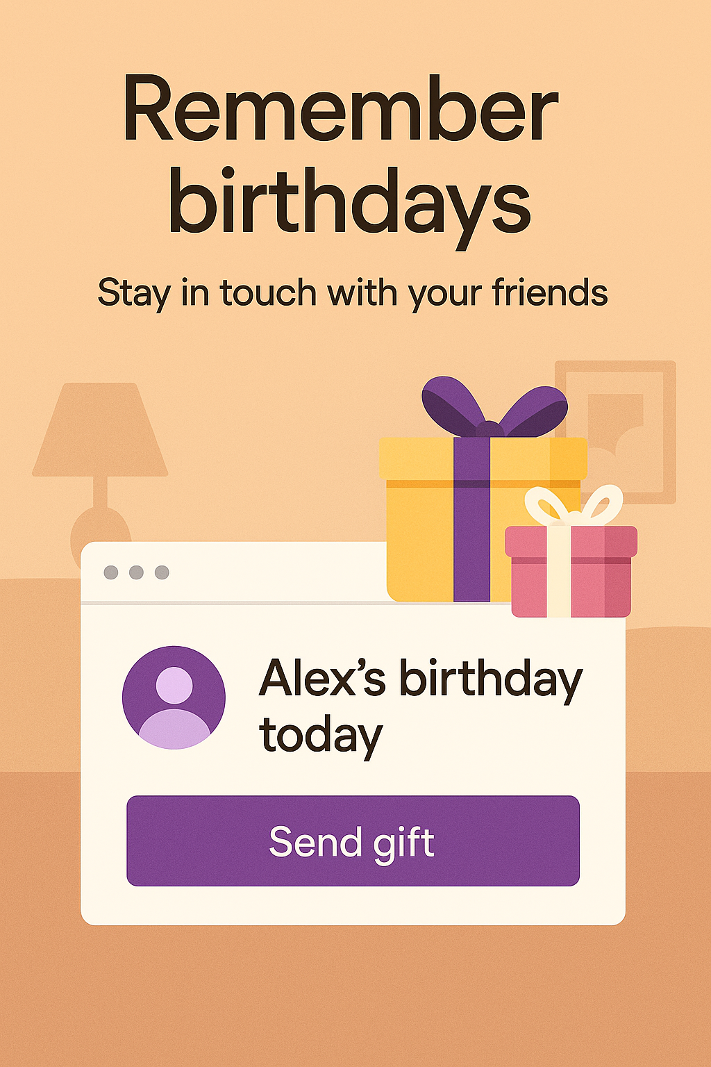 A visually appealing digital graphic promoting birthday reminders, featuring gift icons and a user-friendly interface, ideal for social media or app marketing.