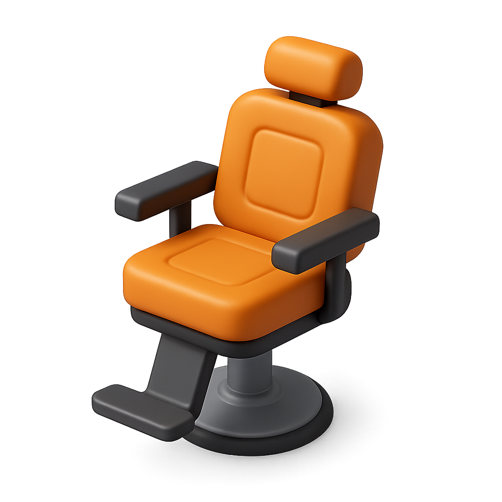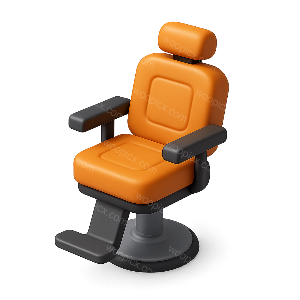 A stylized 3D icon of a barber chair featuring a vibrant orange seat, headrest, and armrests. The chair is presented in a three-quarter isometric view with a glossy finish.