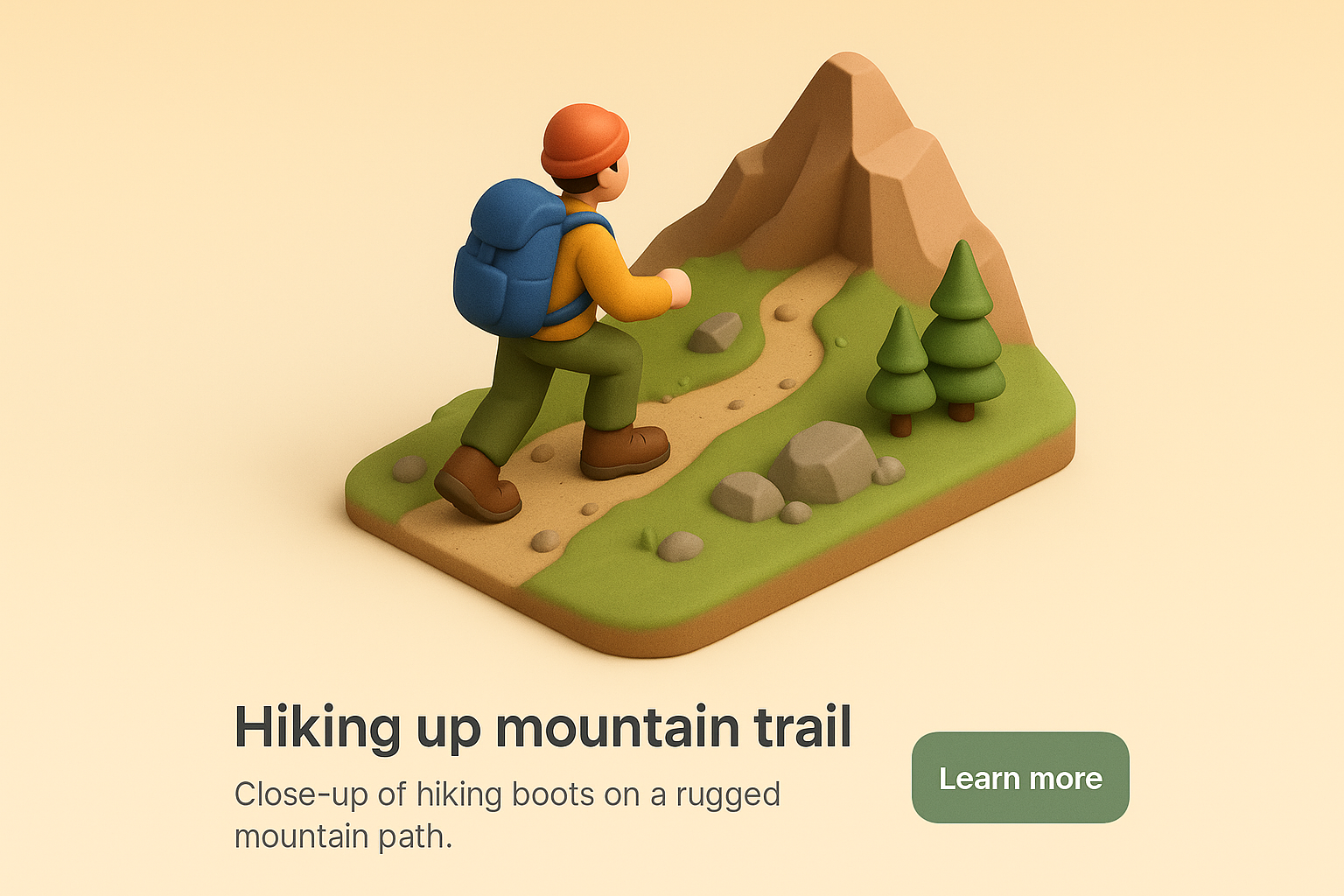 /Collection: /by davooda/Type: PNG/A detailed 3D illustration of a man hiking up a rugged mountain trail, showcasing leather hiking boots and surrounding nature elements. The scene is designed with a smooth gradient background and emphasizes realism.
