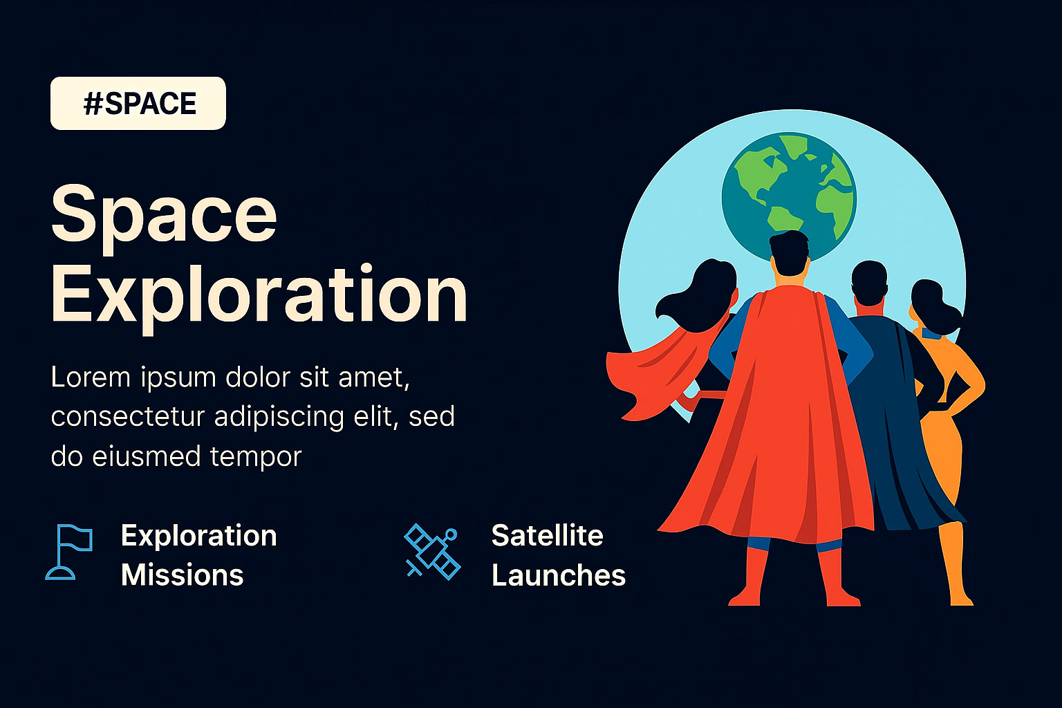 Stylized graphic depicting a diverse group of superheroes facing Earth, representing space exploration. Ideal for educational or promotional content related to space missions.
