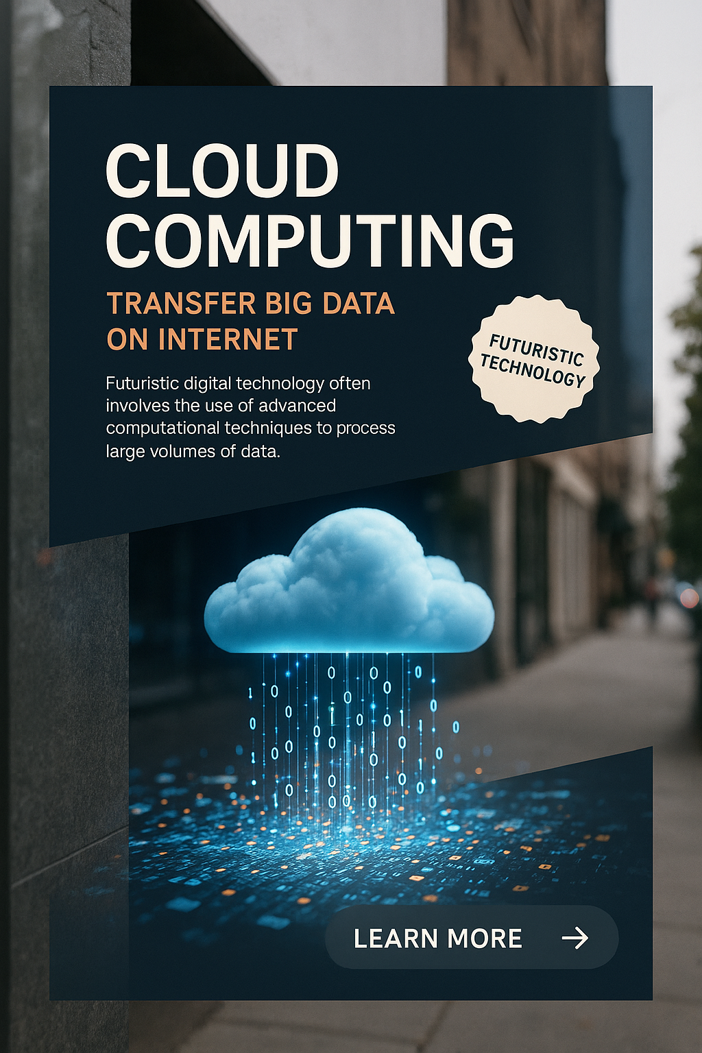 /Collection: /by davooda/Type: PNG/This image showcases a futuristic representation of cloud computing and big data transfer. It features a layered design with a prominent cloud graphic and a street background, emphasizing digital technology.