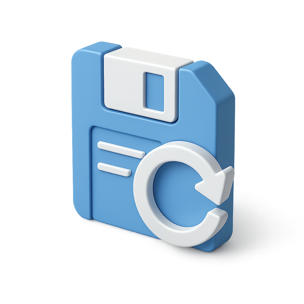 /Collection: /by davooda/Type: PNG/A visually appealing 3D icon representing a restore point. The design features a blue floppy disk with a circular arrow, creating a modern isometric look against a subtle background.