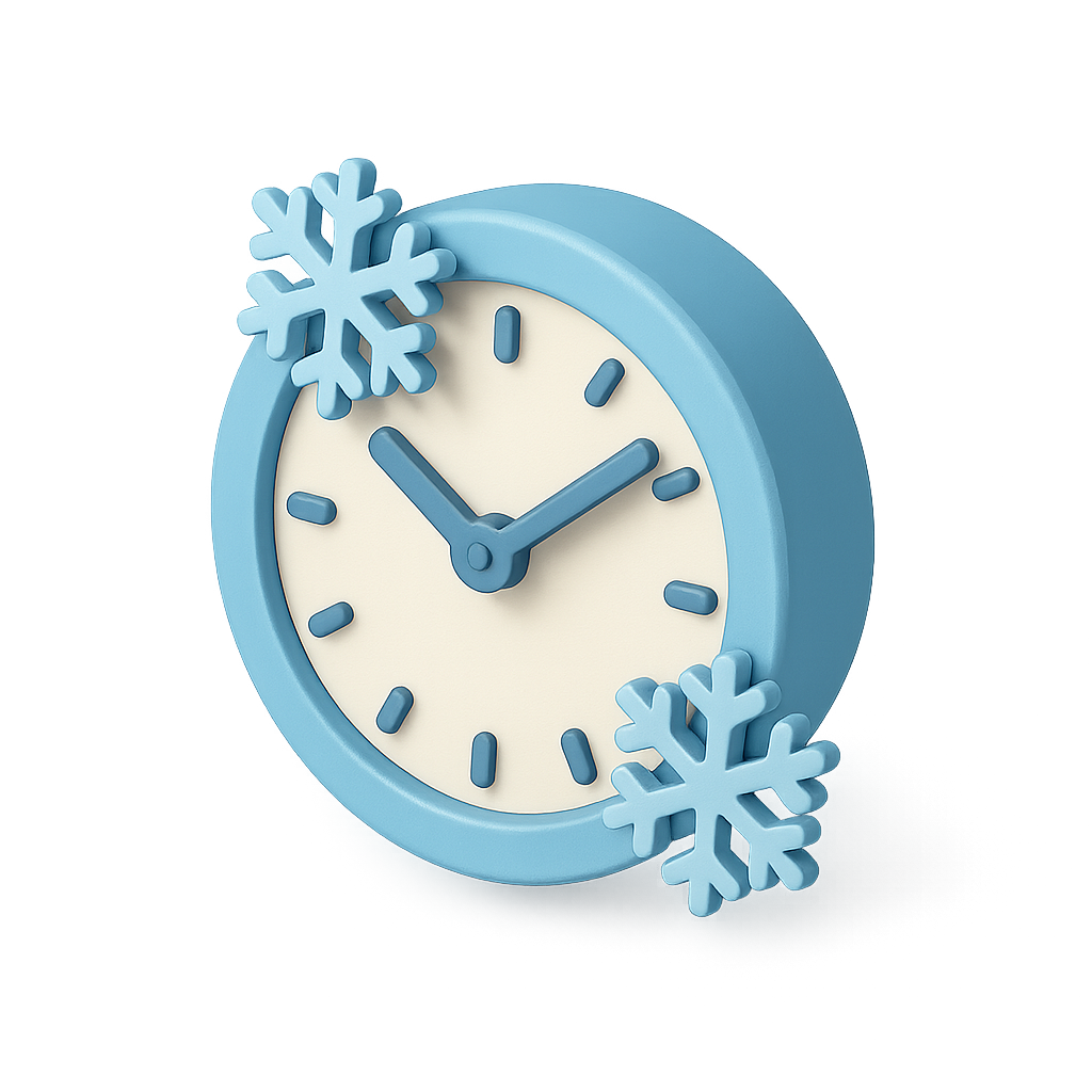 A 3D clock icon featuring a light blue circular design with snowflakes on either side. It has a soft, volumetric look and is displayed in a three-quarter view against a subtle background.