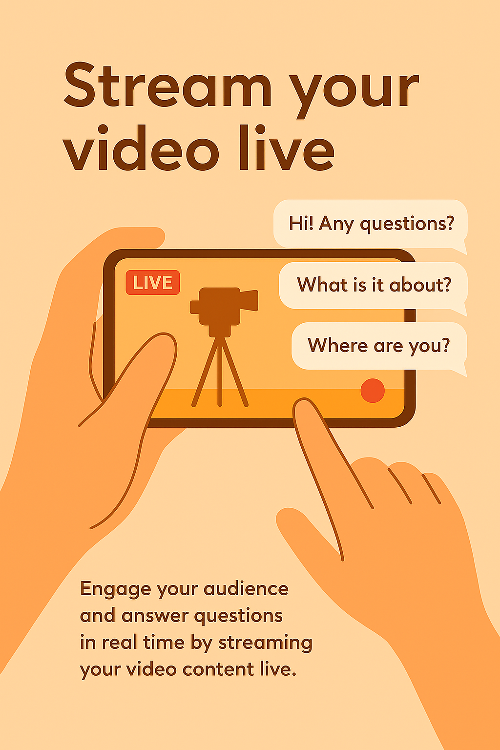 /Collection: /by davooda/Type: PNG/Illustrative graphic showcasing the concept of live video streaming, featuring hands holding a smartphone with a camera icon. Ideal for promoting online engagement and Q&A during live sessions.