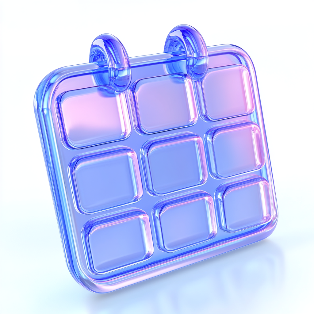 A modern and sleek 3D calendar icon featuring a translucent design with pastel colors. Ideal for digital applications and user interfaces.