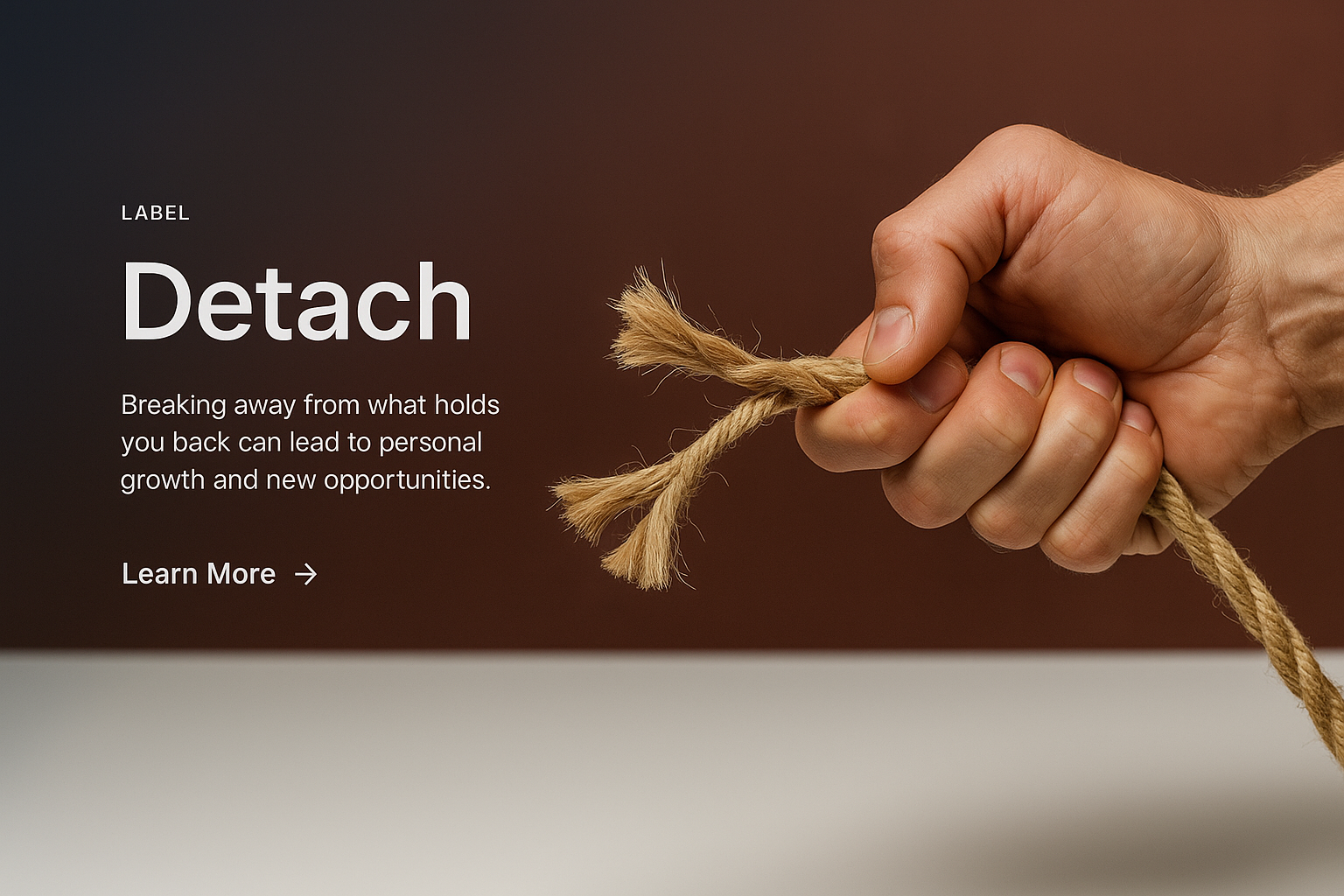 The image showcases a hand gripping a frayed rope with a minimalistic background. It features a label and a call-to-action button, emphasizing the theme of detachment and personal growth.