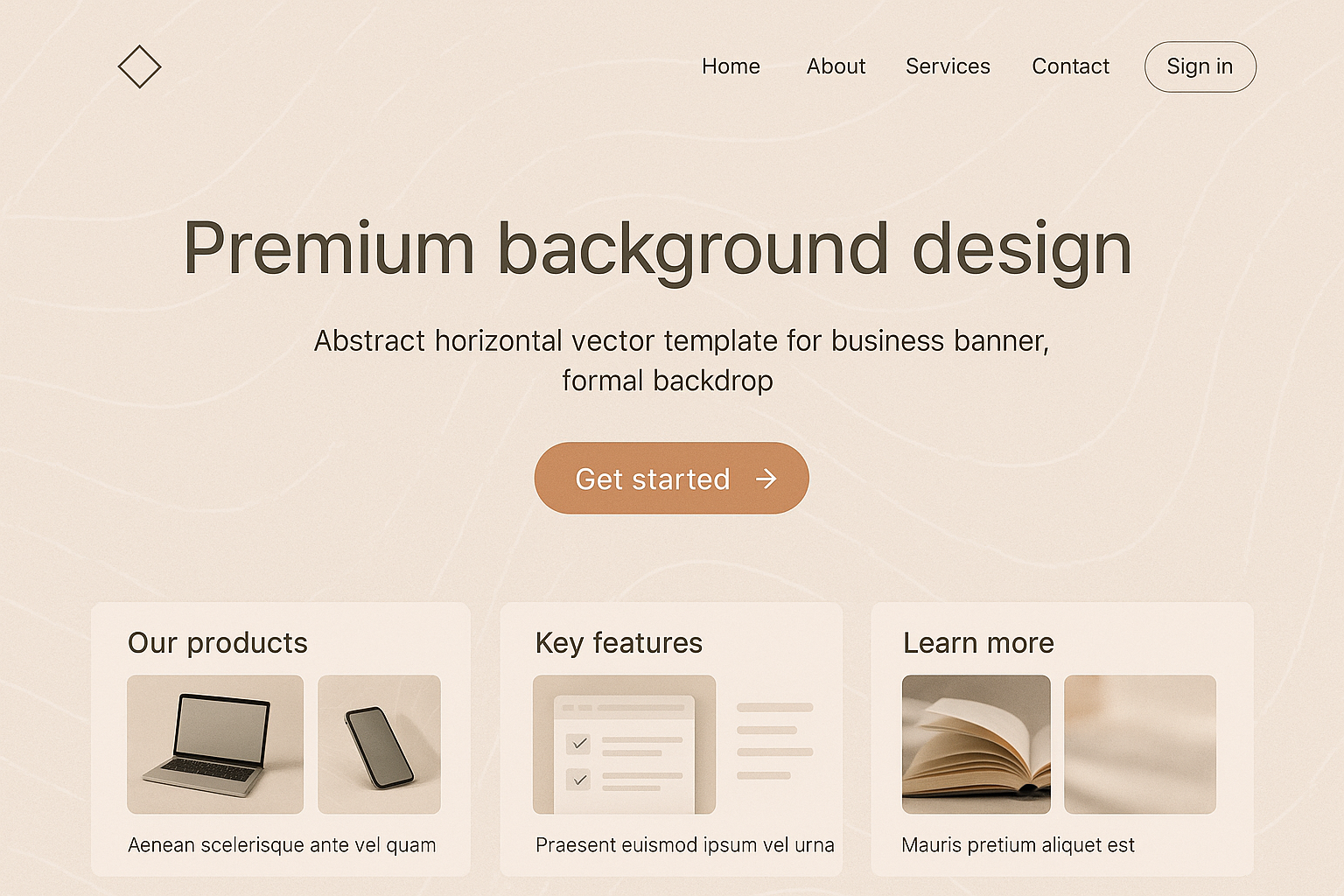 /Collection: /by davooda/Type: PNG/This image showcases an elegant landing page design featuring a premium background, geometric logo, and organized content blocks for products and features. It emphasizes readability with small font sizes and a clean layout.