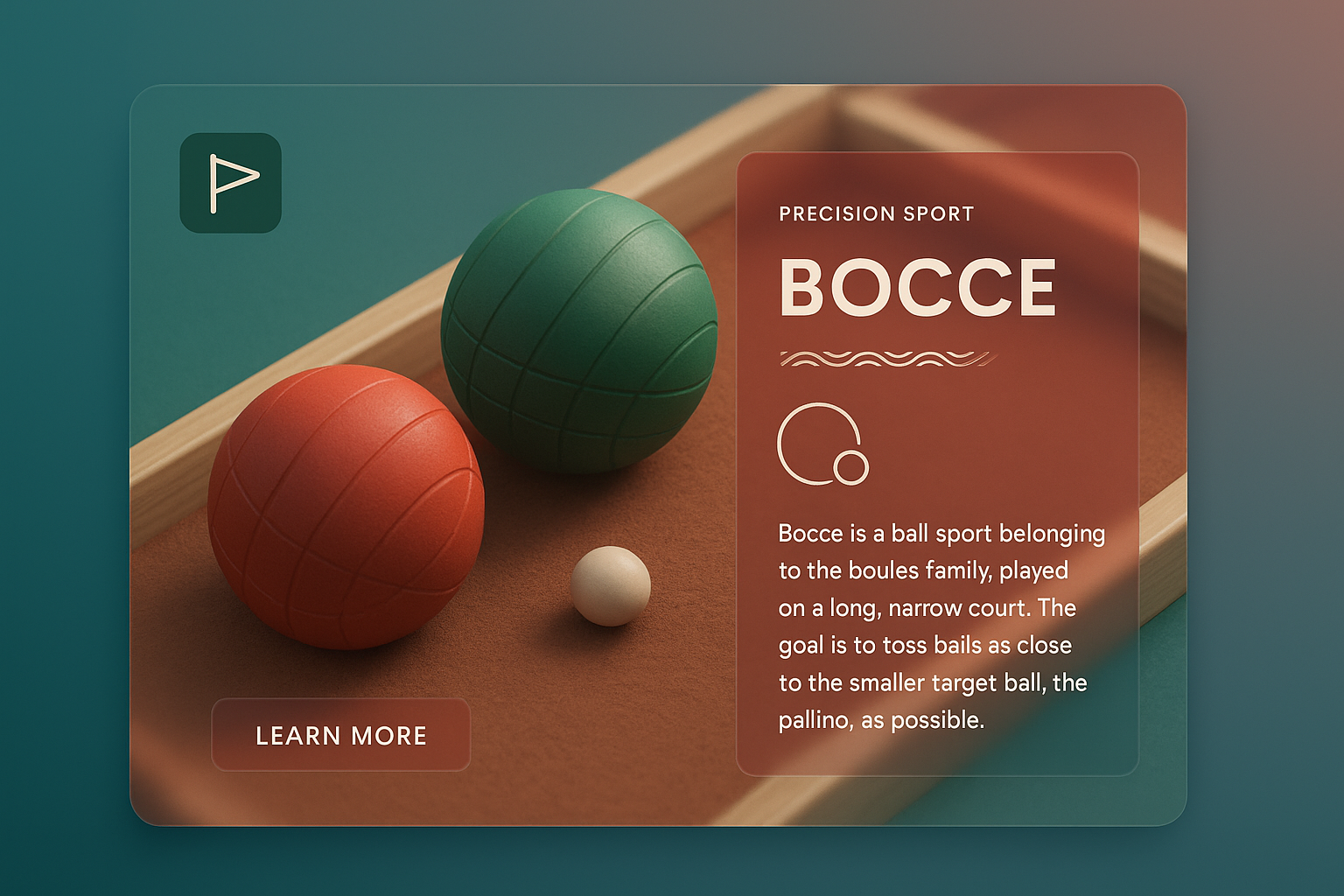 A visually striking design showcasing bocce balls on a wooden court. The layout features a transparent overlay with text and graphics, emphasizing the sport's essence.