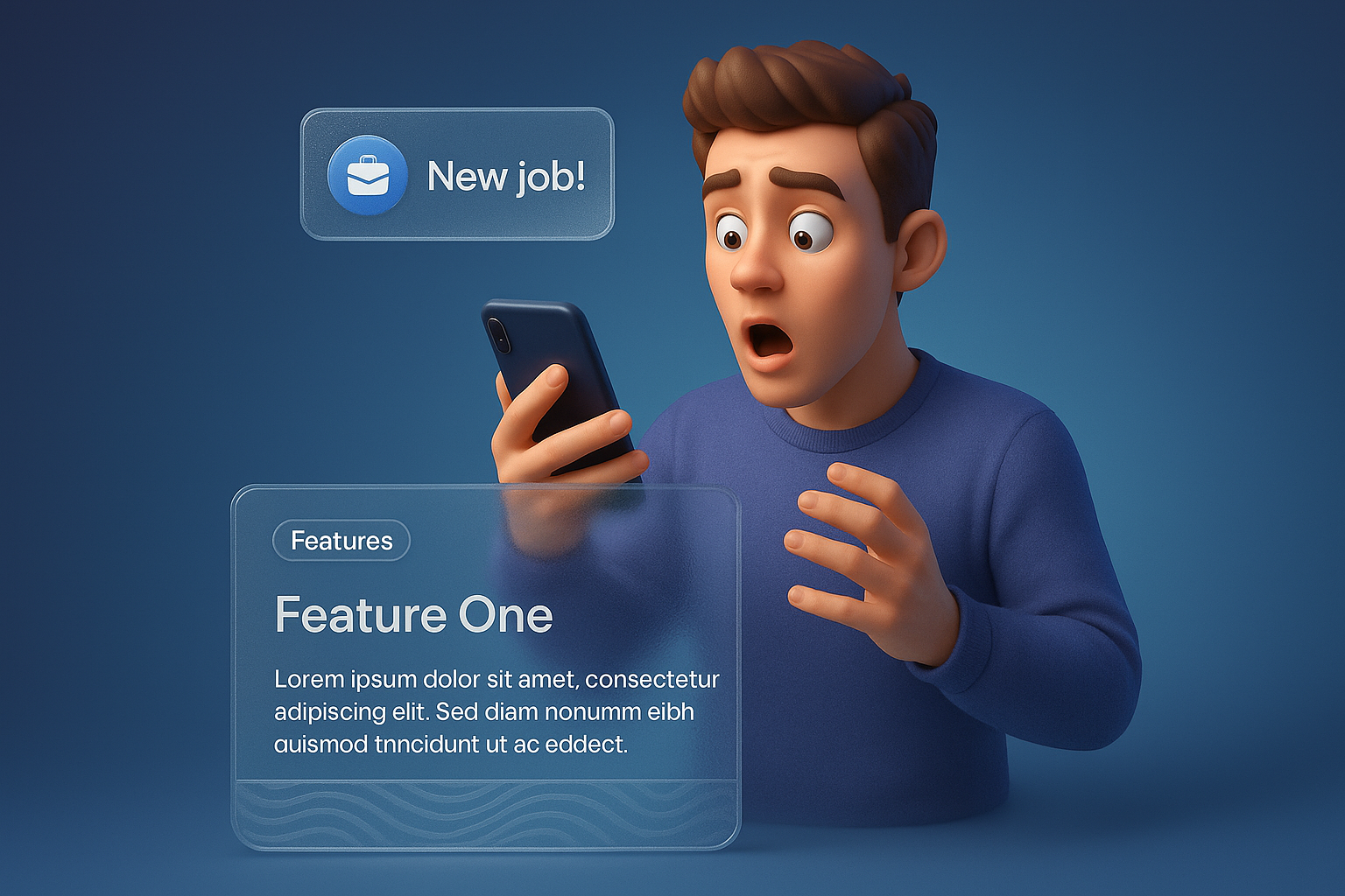 /Collection: /by davooda/Type: PNG/A young man, surprised, looks at his phone displaying a job notification. The image features a modern design with a gradient background and a translucent feature block highlighting job details.