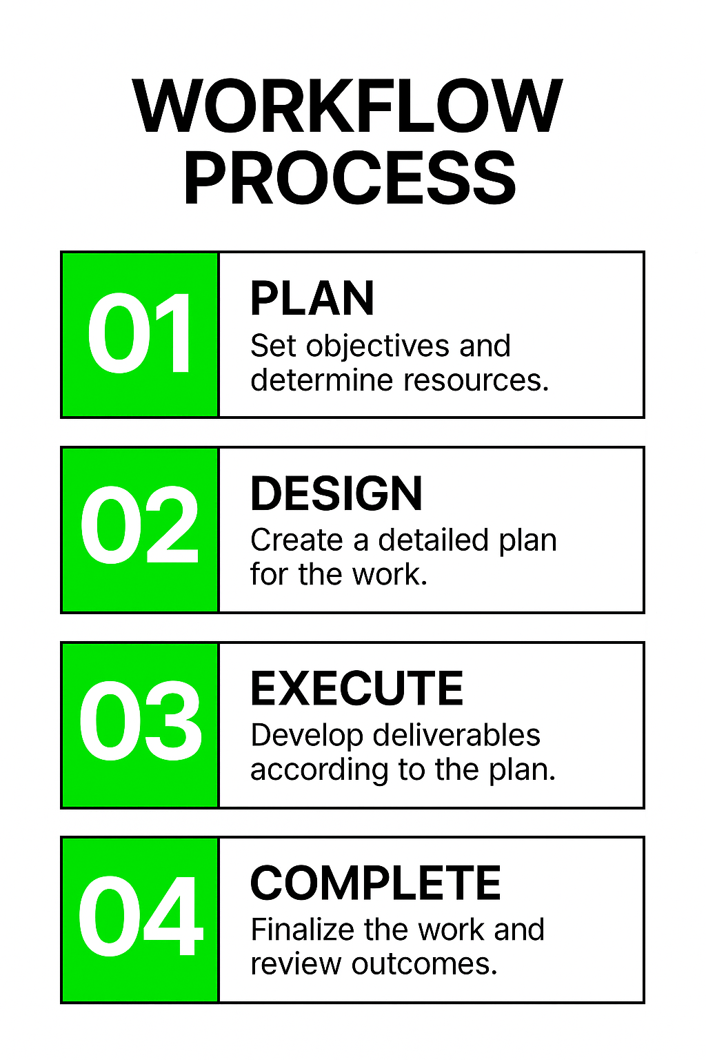 Clear infographic illustrating a four-step workflow process with bold typography and vibrant colors, ideal for educational or business presentations.