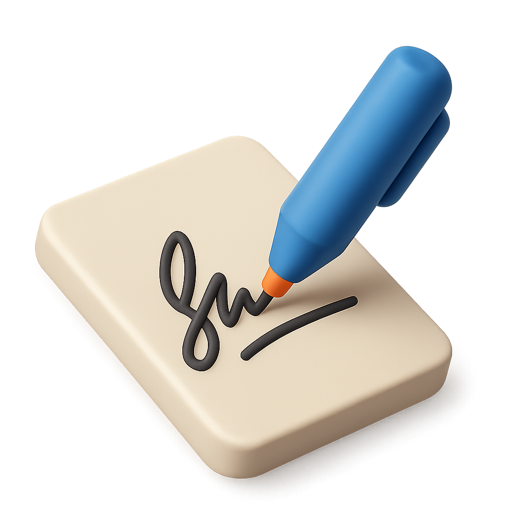 A visually appealing 3D icon featuring a signature on a cream-colored surface, accompanied by a blue marker. The design showcases depth and a three-quarter view.