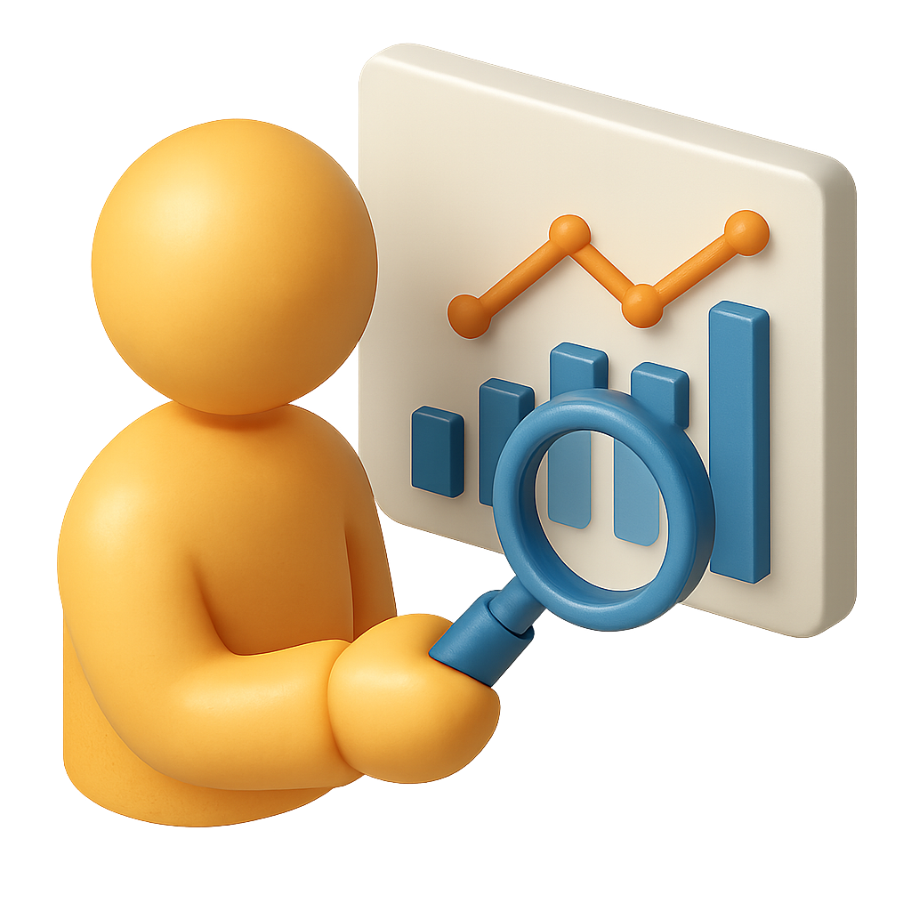 A stylized 3D icon featuring a person analyzing data represented by bar graphs. The figure holds a magnifying glass, emphasizing data scrutiny. The background is transparent, showcasing a clean and modern design.