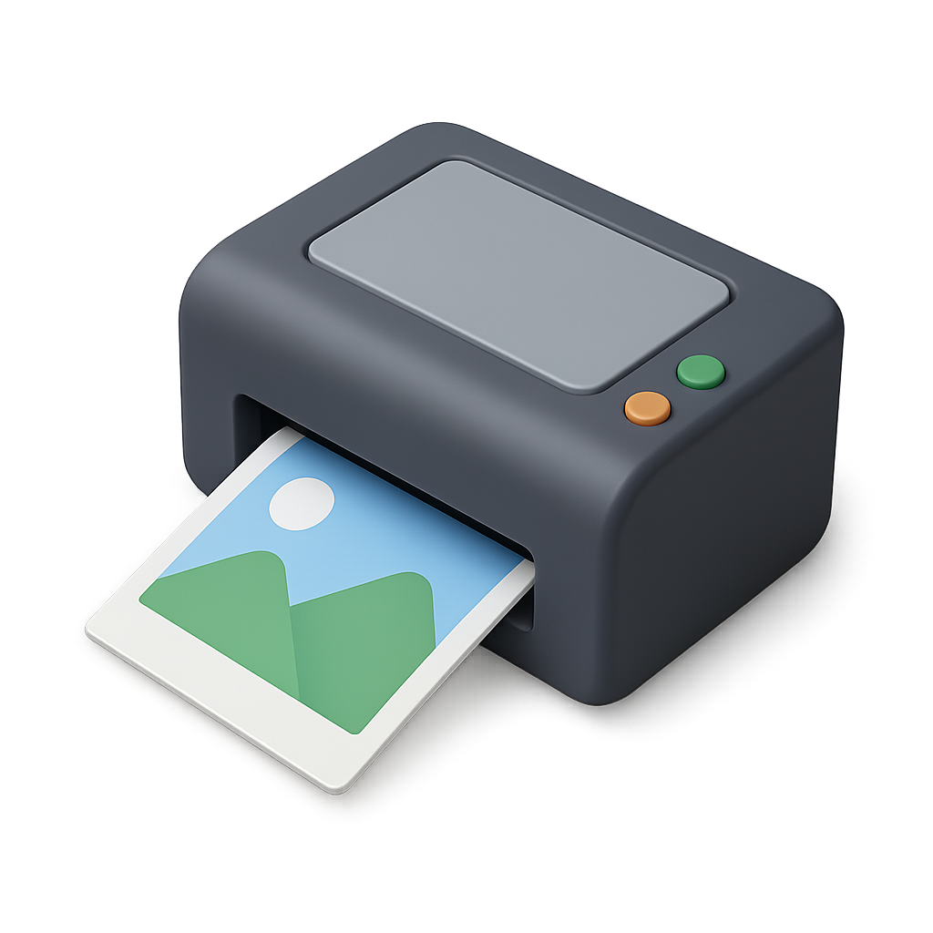 /Collection: /by davooda/Type: PNG/A visually appealing 3D icon of a photo printer designed in an isometric style. The printer features a sleek, rounded body with a small screen and colorful buttons, and an image is being printed, showcasing a scenic landscape.