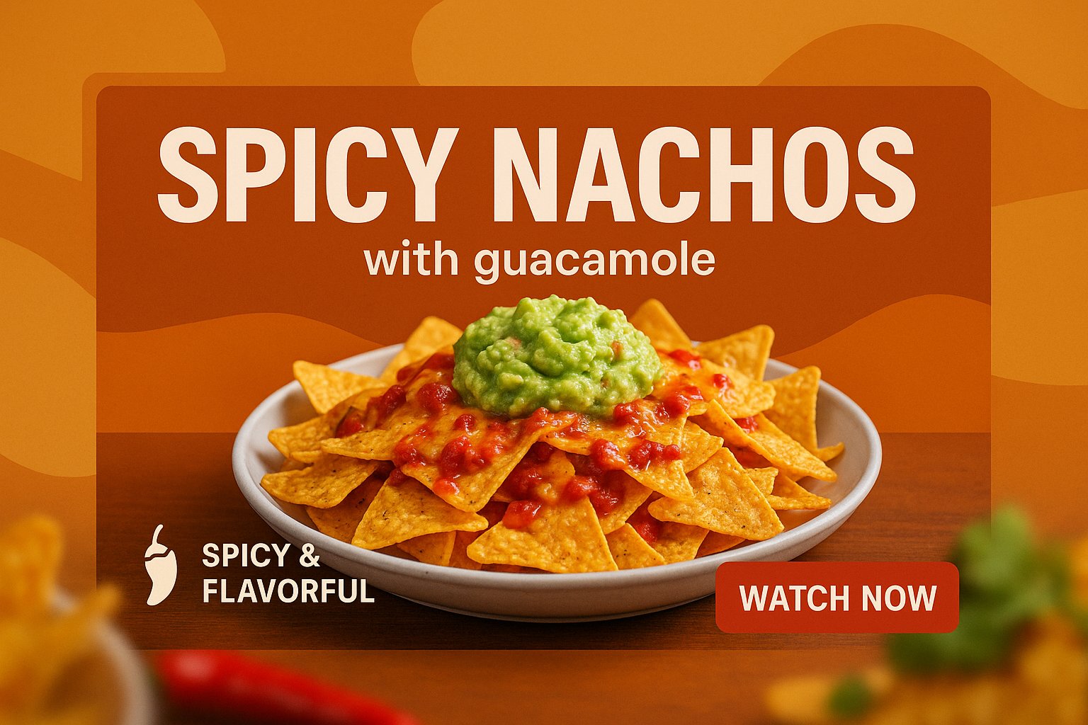 Vibrant promotional graphic featuring a plate of spicy nachos topped with guacamole, ideal for food marketing and restaurant promotions.