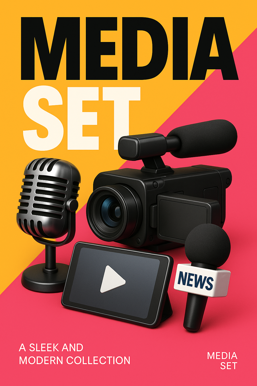 A hyper-realistic media set featuring a microphone, camera, and smartphone, designed for modern digital platforms. The layout is bold with bright color blocks and dynamic text.