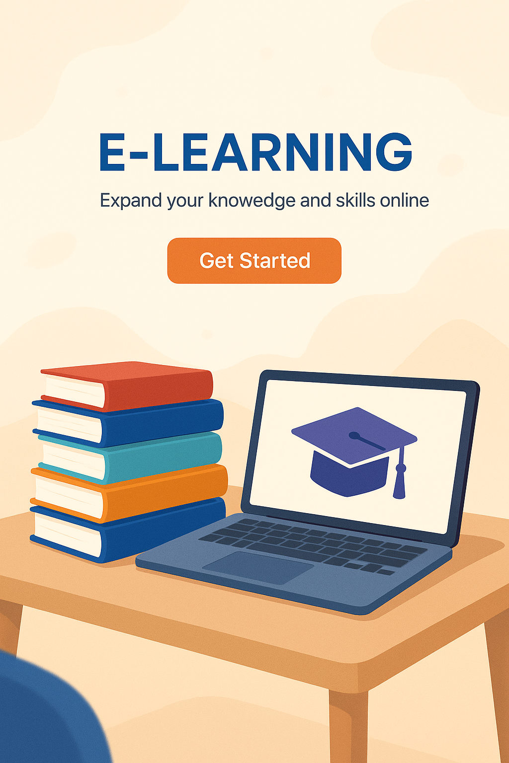 Colorful e-learning promotional graphic showcasing a laptop with graduation cap icon and stacked books, designed to attract online learners.