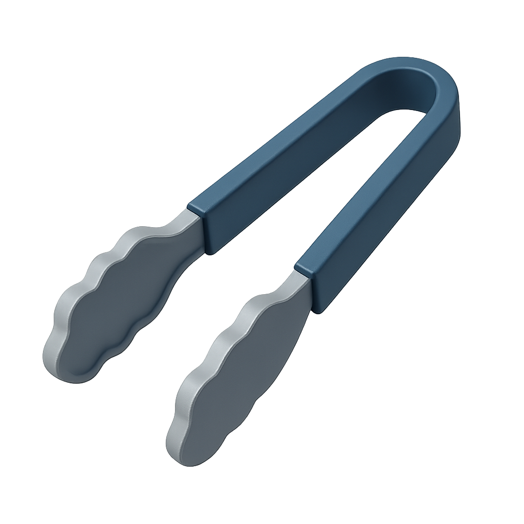 This image features a sleek 3D icon of tongs viewed from a three-quarter angle, showcasing a modern design with a volumetric look and a transparent background.