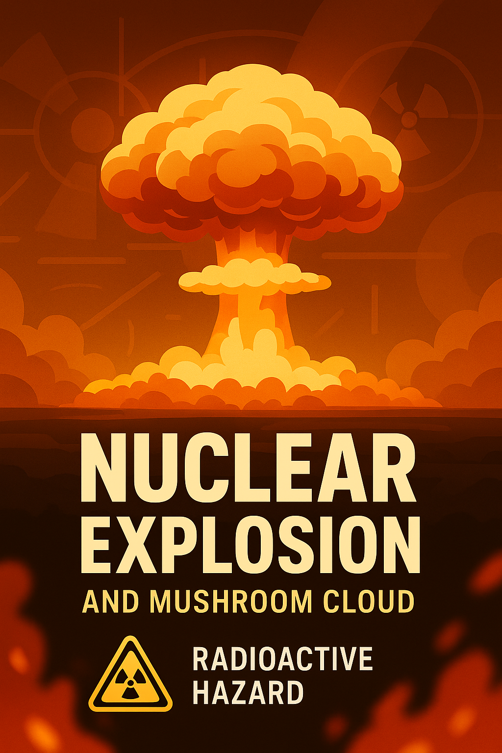 /Collection: /by davooda/Type: PNG/Dramatic illustration depicting a nuclear explosion and mushroom cloud, designed to convey the concept of nuclear hazards. Ideal for educational materials or awareness campaigns.