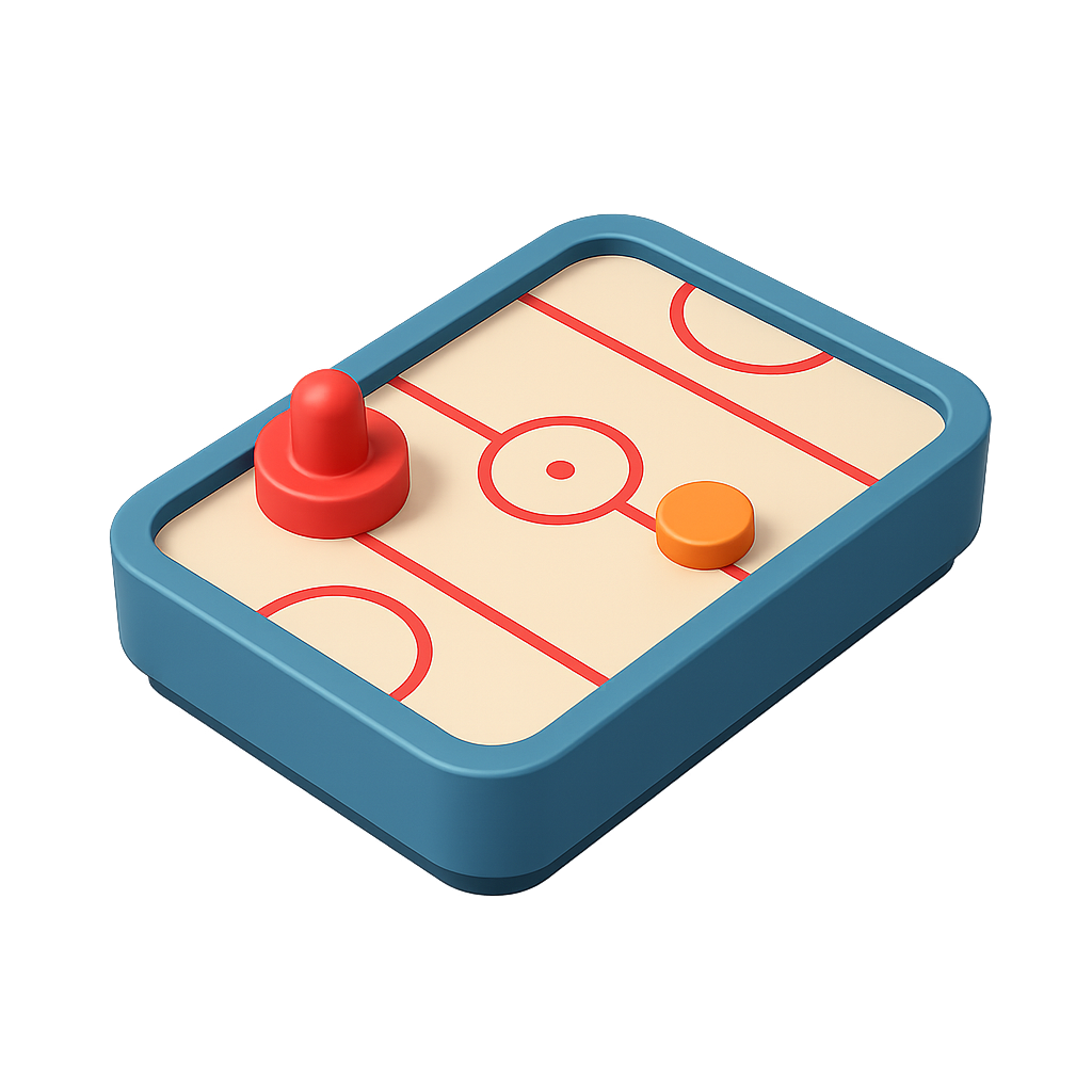 A visually appealing 3D icon of an air-hockey table, featuring a red puck and an orange disk on a cream-colored surface. The design is isometric with a transparent background.