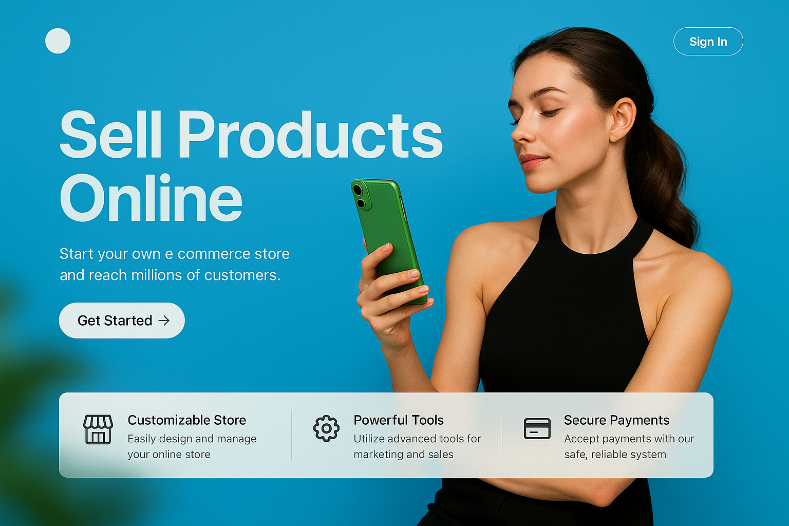 A dynamic landing page featuring a model holding a green phone, showcasing an e-commerce theme. The background is bright blue, enhancing the modern aesthetic.